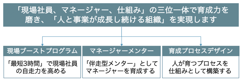 私たちは「人を育てる力の向上」を「重要な組織課題」と捉え、「現場社員の自走力」「マネージャーの育成力」「人が育つ仕組み力」の向上を通して、「「人を育てる力」を組織の強みとして磨き込む」ご支援をしております。