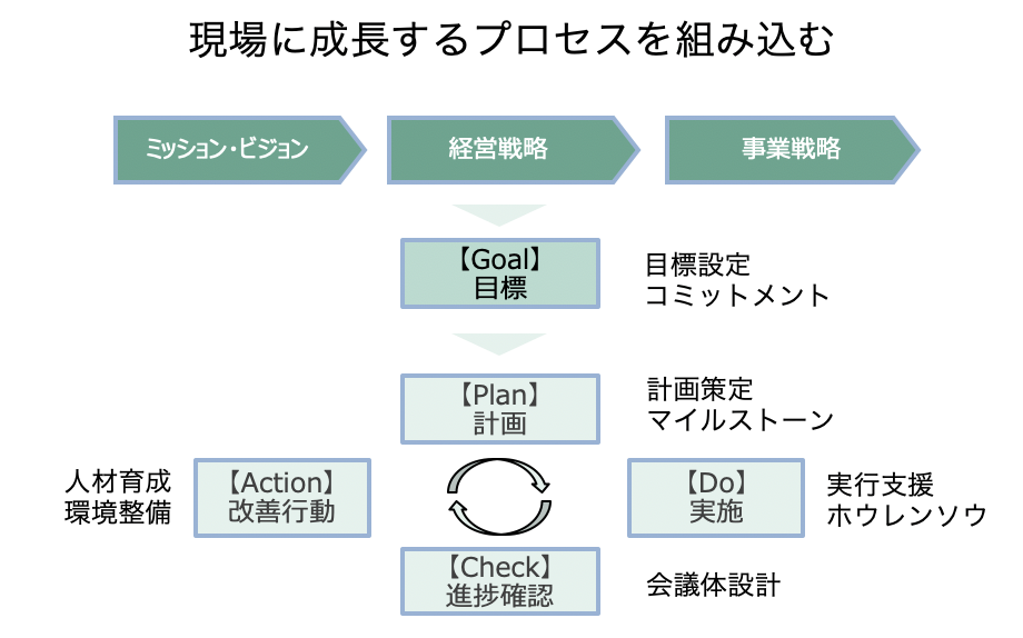 弊社の「育成プロセスデザイン」は「この仕組みに乗っていれば成長する」というプロセスを組織の中にデザインします。