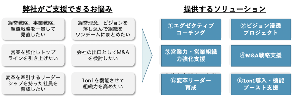 | ④M&A戦略支援 | M&Aは手段の一つです。M&Aを目的とせず、貴社が目指すべきゴールは何か、M&Aをするのであれば、どうシナジーを最大化するのかを、外部プロフェッショナルとのアライアンスでご支援させていただきます。 |